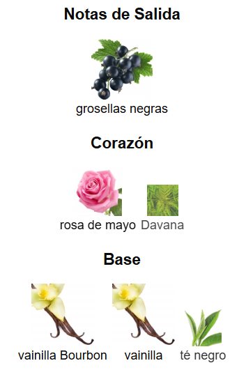 (Sexy, elegante, vainilla sofisticada, grosella negra boozy)