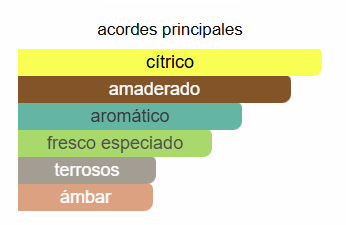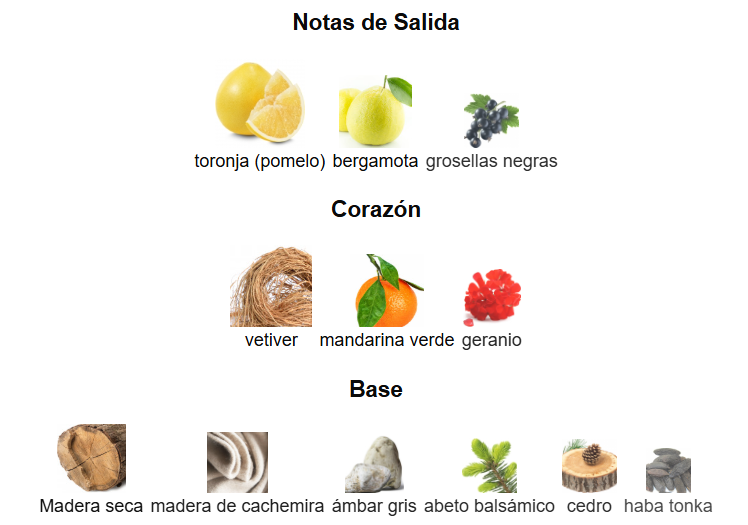 Notas de salida: Toronja, Bergamota, Grosella negra.Corazón: Vetiver, Mandarina verde, Geranio.Fondo: Madera seca, Madera de cashmere, Ámbar gris.